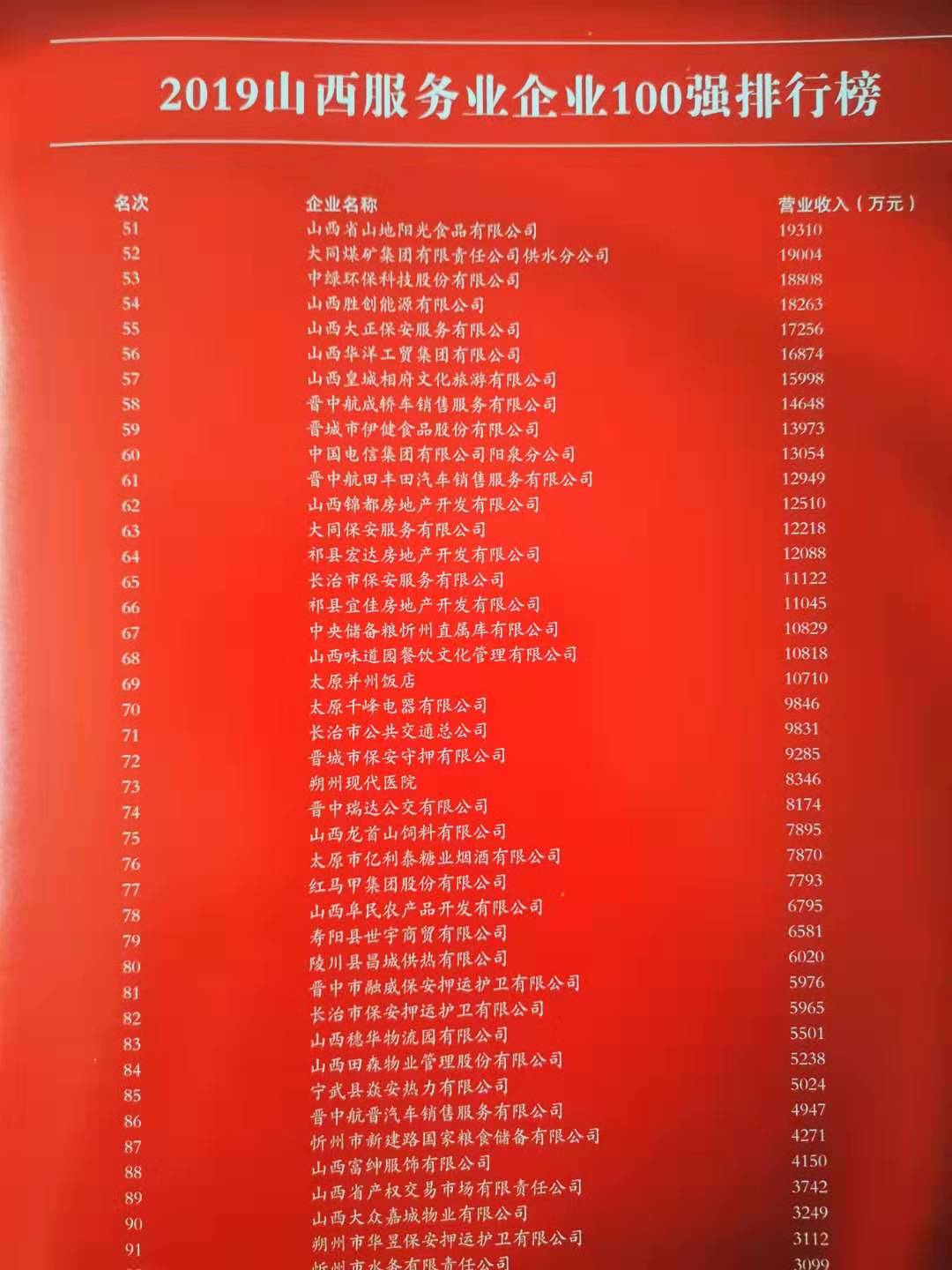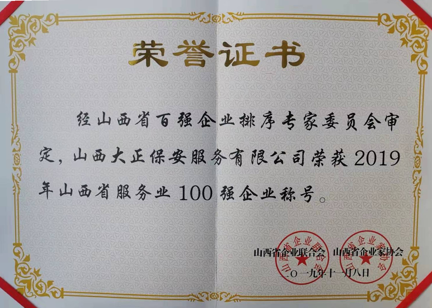 11月8日,2019山西企業(yè)100強在省城太原發(fā)布。經(jīng)山西省百強企業(yè)排序?qū)<椅瘑T會審定,山西大正保安服務有限公司再次榮獲“山西省服務業(yè)100強企業(yè)”,這是該公司自2014年以來連續(xù)五次榮登該榜。公司黨委副書記、副總經(jīng)理陳志平前往參會。