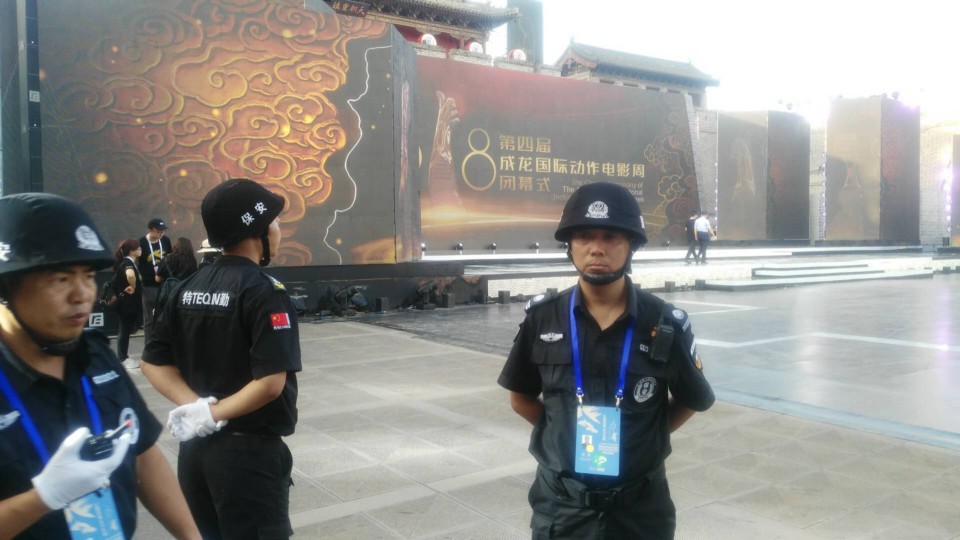 圖為公司保安隊(duì)員在第四屆成龍國際動(dòng)作電影周閉幕式執(zhí)勤現(xiàn)場