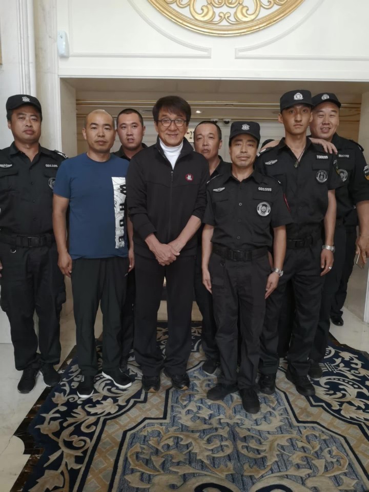 圖為成龍大哥在其下榻賓館和我公司提供安保服務(wù)的保安隊(duì)員合影留念