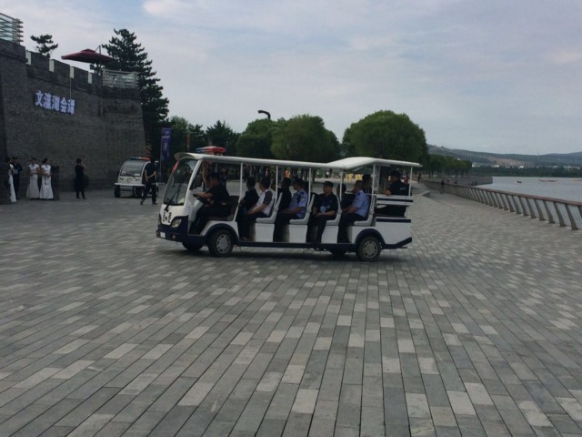 圖為公司總經(jīng)理?xiàng)顒俸昱阃泄簿诸I(lǐng)導(dǎo)乘坐電瓶巡邏車檢查“文瀛湖會(huì)譚”安保情況